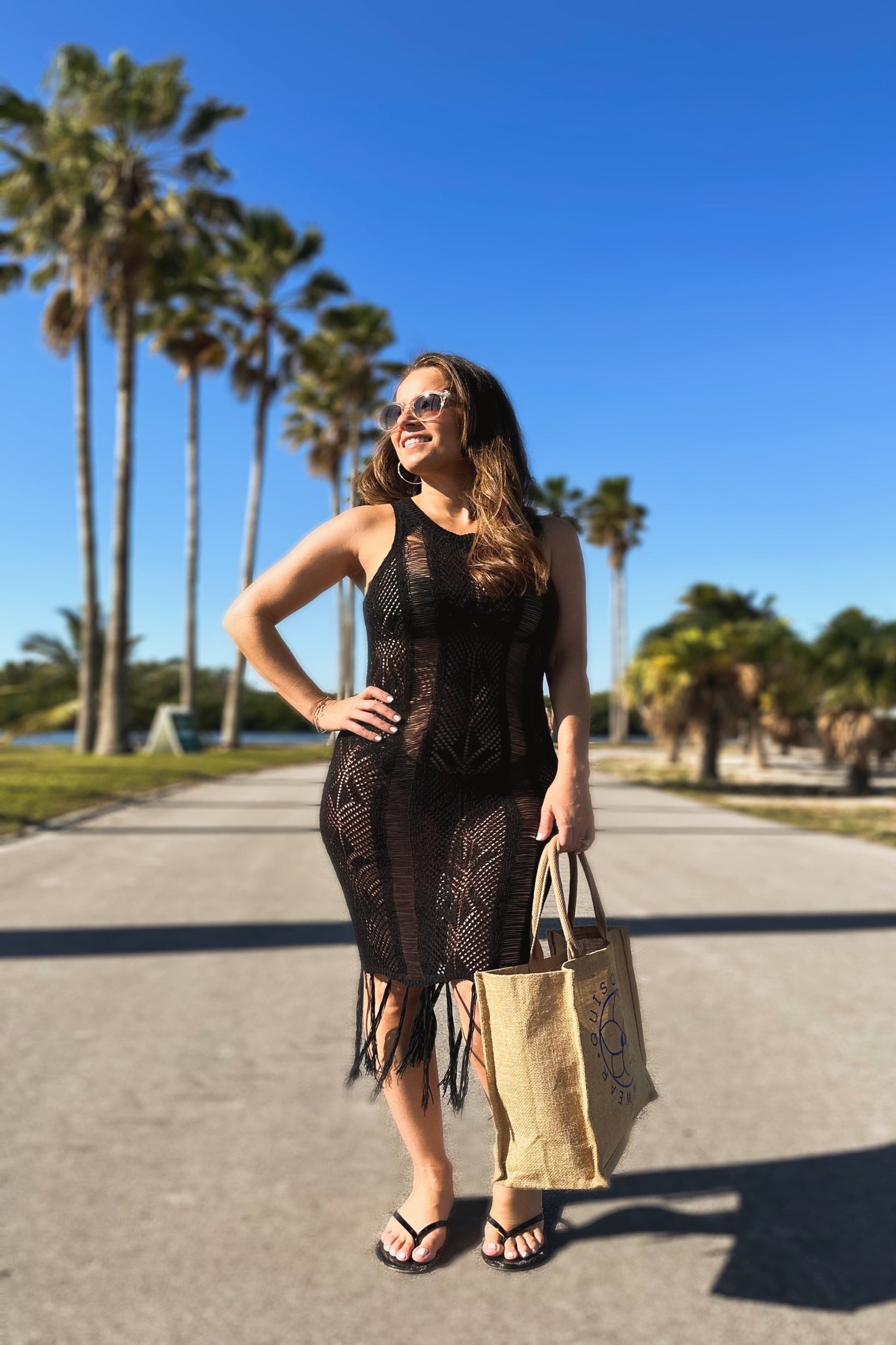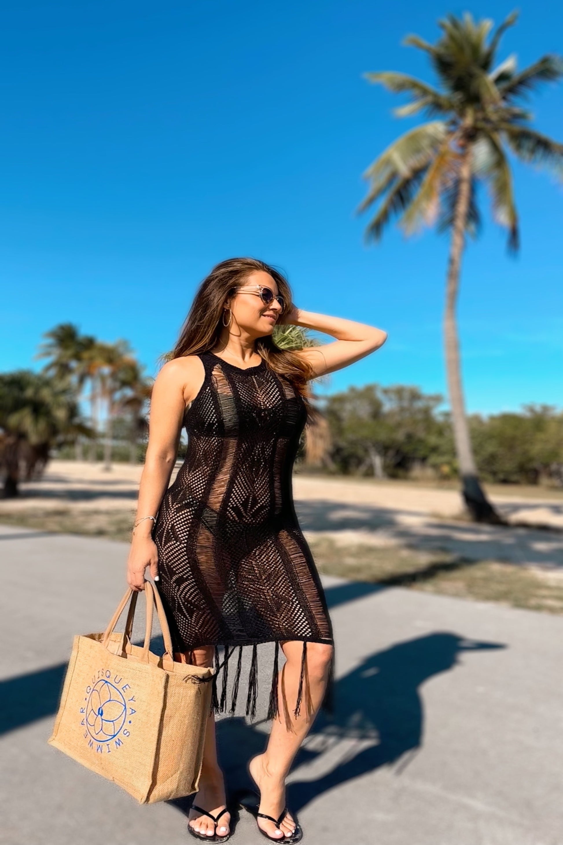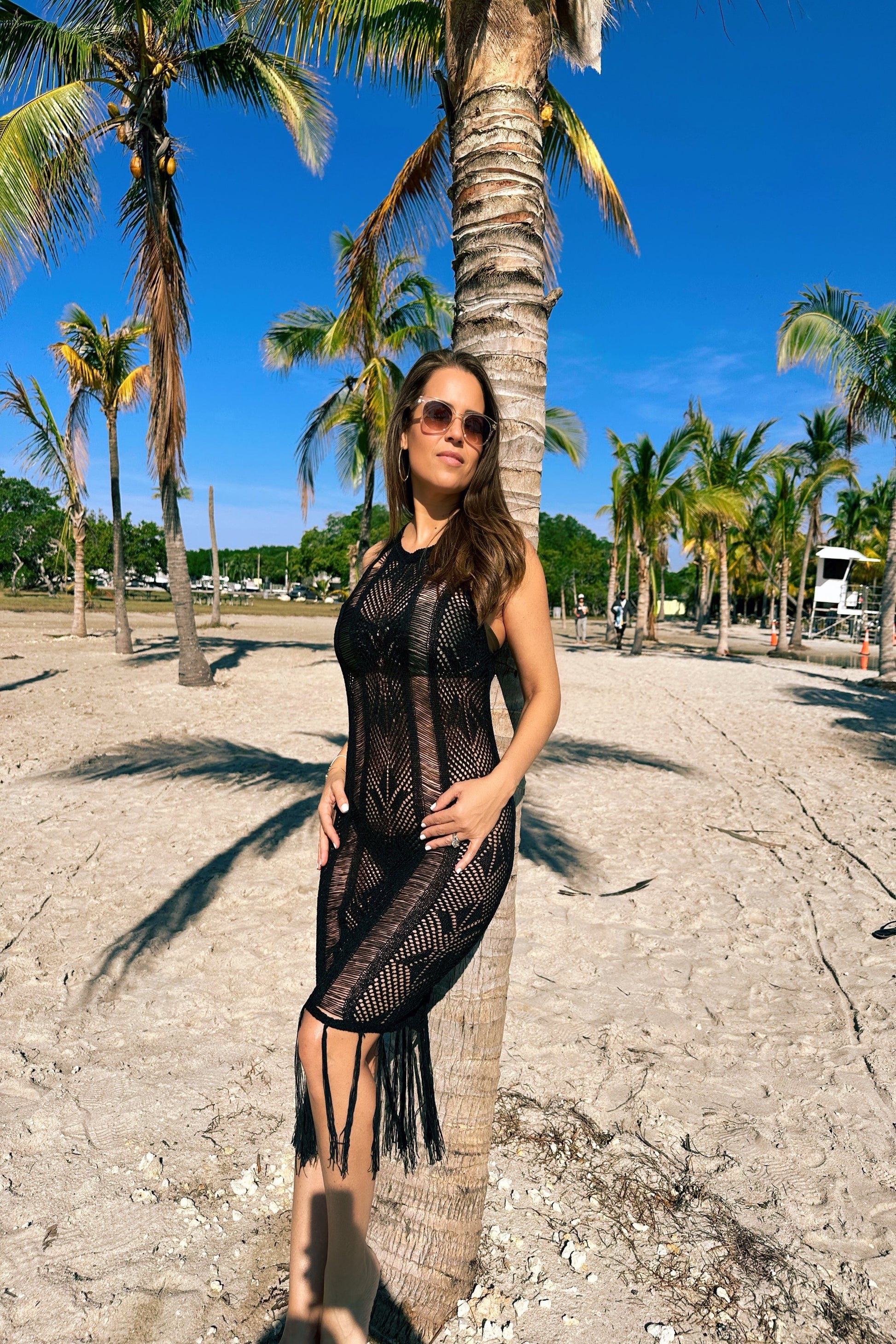 Expertly crafted with intricate crochet details, this black coverup is both sexy and form-fitting. Made with precision, it's the perfect addition to elevate your beach or poolside look. Feel confident and elegant while lounging in this stunning garment.